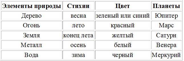 Древние китайцы приняли за основу цикла время двух оборотов Сатурна вокруг Солнца, равное 60 годам. За это время Юпитер совершает пять оборотов. Согласно китайской натур-философии, цифра 5 символизировала пять элементов природы. Это дерево (по-японски ки), огонь (хи), земля (цути), металл (канэ) и вода (мидзу). Каждый из этих элементов нес в себе единство противоположностей — инь-ян. Поэтому любой элемент имел положительные и отрицательные качества. Например, вода. Она необходима для произрастания сельскохозяйственных культур и существования всего живого, но она же могла нанести большие разрушения во время наводнений. Этим элементам соответствовали цветовые обозначения: синий или зеленый (по-японски эти понятия передаются одним иероглифом), красный, желтый, белый, черный, которые применялись при обозначении планет и времен года (стихий). Соотношение элементов природы, стихий, цвета выглядит следующим образом [88, с. 81]: