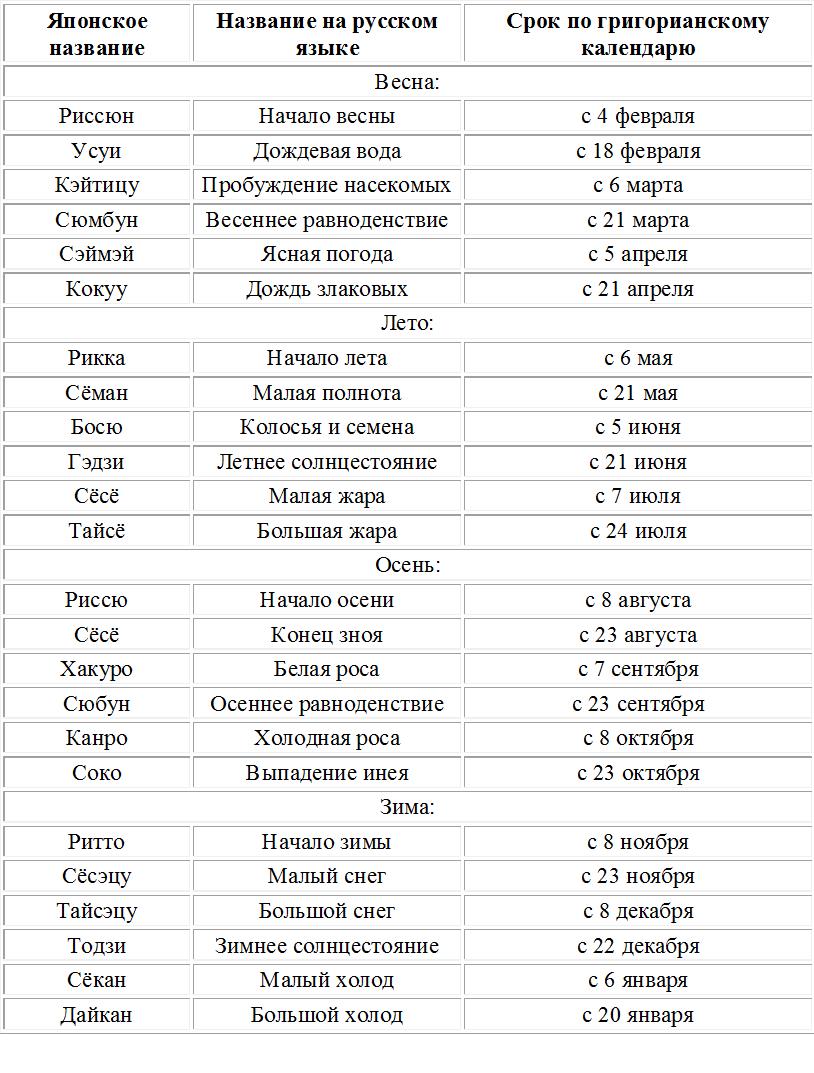 Как и другие народы Восточной Азии, японцы делили сельскохозяйственный год на четыре больших сезона: весна (хару), лето (нацу), осень (аки) и зима (фую). Эти большие сезоны, в свою очередь, делились на шесть малых, по 15 дней в каждом, и носили названия кисэцу или сэкки. Таким образом, получалось 24 сезона. Малый сезон, в свою очередь, состоял из трех более мелких — ко, в каждом из которых было по пять дней. Всего было 72 ко. Это деление еще более подробно детализировало погодные приметы и земледельческий календарь [116, с. 702–704].