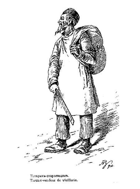 Примерно раз в неделю под окнами раздавалось заунывное: «Старье берем! Старье берем!» Татары-старьевщики в тюбетейках и длинных выцветшие халатах, чаще всего по двое, по зазыву из окон приходили на квартиры покупать поношенную одежду. Сбывал её обычно отец, умевший и любивший поторговаться.