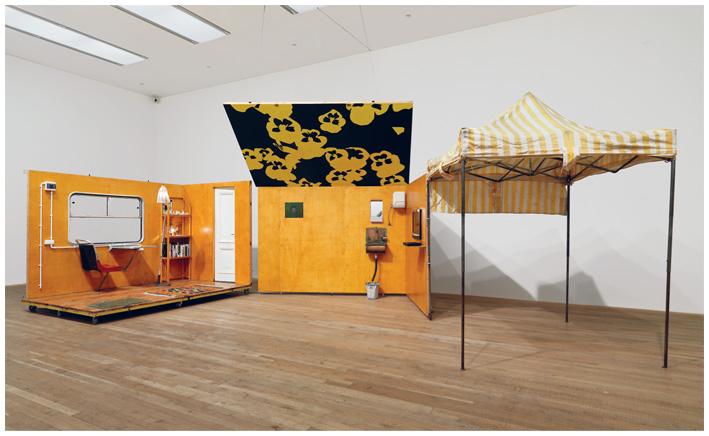 Несколько десятилетий инсталляции сосредоточивались на зрителе. Его погружали во всеобъемлющую среду, воздействующую на все органы чувств одновременно. Но некоторые современные художники ищут способы сделать свои произведения более компактными, демонстрируя своего рода живую картину, сцену. Например, инсталляция Павла Альтхаммера (род. 1967) «ФГФ, Варшава», 2007 год (рис. 10). Это одновременно и скульптура, созданная автором совместно с другими мастерами, и передвижная выставка. Полная экспозиция включает несколько произведений актуального искусства разных художников и занимает пять залов Современной галереи Тейт. Каждая работа создает ощущение постановки. Внутри галереи появляется новое, фиктивное пространство: дом, театр, общественное место либо обстановка учреждения. Инсталляция включает четыре перегородки из ДВП; деревянную платформу; дверь с ручкой Моники Сосновской (род. 1972) и найденные объекты: трамвайное окно, сиденье и столик. Еще в нее входят деревянный стеллаж с журналом, книгами, каталогами и бумагами; несколько мягких скульптур; стул в миниатюре и подставка под статуэтки. Помимо этого, демонстрируются картины Якуба Юлиана Зёлковски (род. 1980) и Вильгельма Сасналя (род. 1972), а также DVD-видео Артура Жмиевски (род. 1966) с DVD-плеером и монитором. Еще инсталляция включает металлическую раковину с пластиковой емкостью для воды и ведерком, вращающееся зеркало и найденный объект – тканый навес на металлических ножках. Стены работы «ФГФ, Варшава» можно составить вместе, так, что получится переносной контейнер. В инсталляции воплощены идеи совместного труда и взаимообмена. Она включает работы других художников, а также библиотеку и документальный фильм, которые проясняют первоначальный замысел. Такие произведения ставят под вопрос наши представления о пространстве, материалах и об авторстве в искусстве.