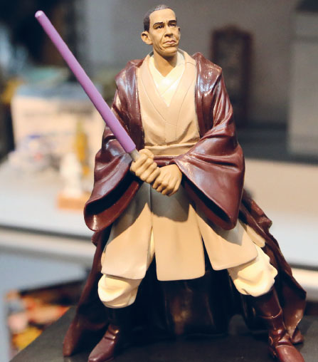 Любительская фигурка Барака Обамы в виде Джедая на ранчо Оби-Ван. Обама – первый президент, смотревший «Звездные войны» в подростковом возрасте, когда они вышли в кино. Он скрестил световые мечи с Олимпийской сборной США по фехтованию, ответил на петицию о Звезде Смерти и был назван Джедаем самим Джорджем Лукасом – а потом перепутал «Джедайский контроль разума» и «Вулканское слияние разумов».