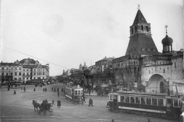 Лубянская площадь. Справа – Китайгородская стена и Никольские ворота, открывавшие въезд на Никольскую ул.