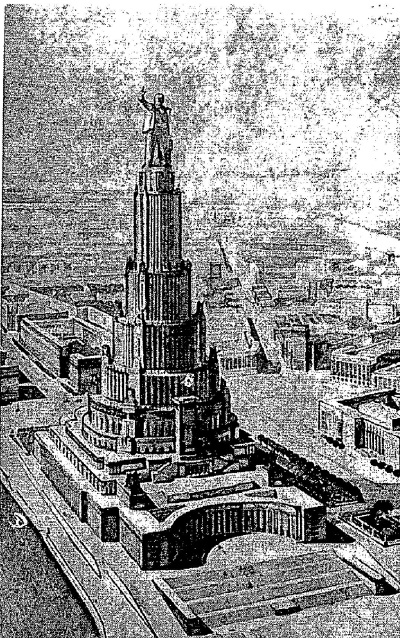 Но сколько в генплане было нелепого и несообразного! «Красную площадь расширить вдвое» – за счет чего? Говорили – ГУМа: вместо него, вернее в глубине, за ним, проектировался огромный и уродливый Дом промышленности, буквально задавливающий Кремль. Композиционным центром города, должен был стать уже не Кремль, а 420-метровый Дворец Советов, увенчанный более чем стометровой статуей Ленина, которая, как говорили знатоки, большее время года была бы окутана туманом и облаками. К нему от Лубянской площади должен был вести новый широченный проспект, жертвой которого стал бы не только квартал против Библиотеки им. Ленина, но и Манеж. Предусматривался снос кварталов между Волхонкой и Большим Каменным мостом; стоит посмотреть этот уцелевший, к счастью, квартал, плотно застроенный капитальными жилыми домами – целый районный город.