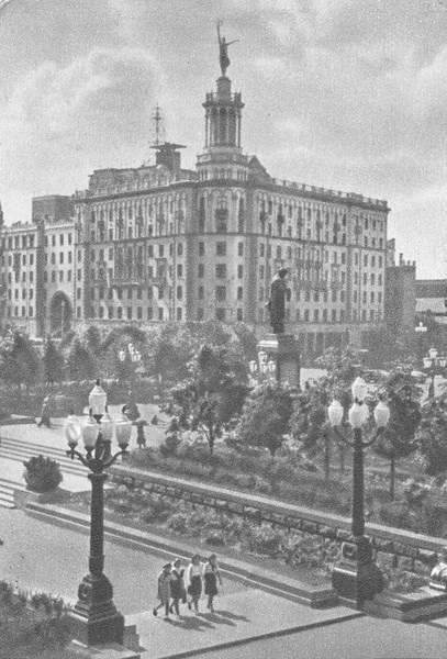 В 1939 году прорубалась новая улица Горького, взрывались и передвигались здания, я бегал смотреть на реконструкцию, старая Тверская мне хорошо была знакома, каждый дом и магазин, но никакого сожаления к ней я не испытывал, снесенное казалось уродующей столицу рухлядью; даже старое поколение москвичей никаких сожалений не высказывало, а радовалось. Правда, к корпусам архитектора Мордвинова москвичи отнеслись с иронией, но благодушной: посмеивались над арабскими башенками, украсившими дома по левой от центра стороне. Как рядовая, фоновая застройка новые корпуса быстро прижились, какое-то единство стиля улицы они создали. Чтобы акцентировать угол дома № 17, выходящего на Пушкинскую площадь, Мордвинов, зодчий весьма посредственный, ни к селу ни к городу установил на верхушке статую балерины с поднятой рукой (а не ногой), ныне давно уже снятую. Под статуей, в начале Тверского бульвара, оказался памятник Пушкину. По этому поводу кто-то посвятил Мордвинову эпиграмму: