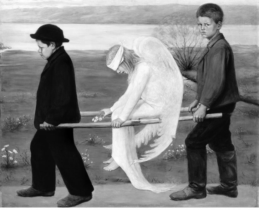 посмотреть работу Хуго Симберга «Раненый ангел» и подумать об ассоциациях, которые она вызывает.