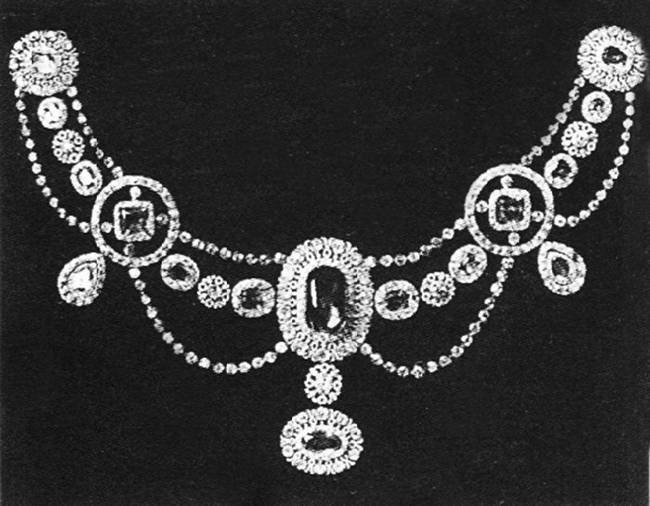 Даже чёрно-белая фотография колье позволила увидеть, как выглядело изделие «Собственного Императорского Ювелира» Якова Дю валя. Сколько раз приходилось всматриваться в чётко выстроенный рисунок этого ожерелья, так напоминавшего эсклаваж убора великой княжны Александры Павловны, исполненного Дювалем в 1795 году![94] В обоих композиция строится на пяти медальонах, соединённых и окружённых цепочками бриллиантов-солитеров. Теперь только эти изящные оковы напоминали прелестницам об их «рабстве»-«esclavage» и повиновении богине любви и красоты Венеры ради привлечения внимания желанных особ противоположного пола. Впрочем, на рубеже галантного и меркантильного веков в моде были во всей Европе ожерелья именно подобного вида. Кстати, Неаполитанская королева Каролина, покинувшая свои владения из-за измучивших её дерзостей Мюрата, оказавшись в 1813 году в Одессе на пути морем в Австрию, подарила на память о себе матери фрейлины Александры Россет «то, что называли тогда склаваж, то есть цепочки, связанные вензелевым шифром (инициалом имени дарительницы. – Л.К.) из крупных бриллиантов» на застёжке-фермуаре, причём всех поражало, с каким искусством жемчуга звеньев были перевязаны бриллиантами.[95]