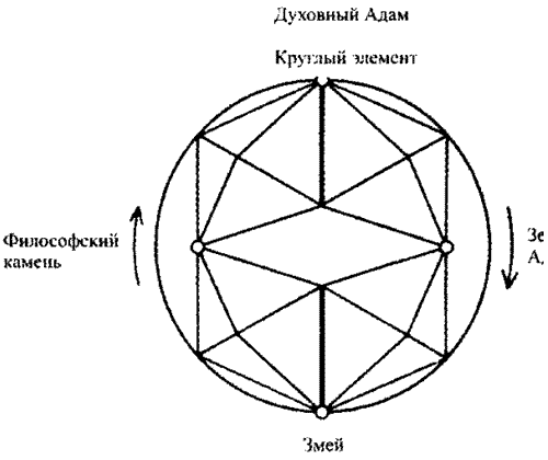 Если мы закрутим эту цепочку по спирали, то получим то, что показано на рисунке справа (но следует помнить, что в самой верхней точке эта ротонда символизирует немного более высокий уровень сознания, чем у первого человека). Эта модель, как указывает Юнг[70], представляет собой линию с основным историческим развитием нашей идеи Бога. Немного ниже располагается визави Адама — змей — явившийся причиной его изгнания. Он соответствует «первичной материи» и служит объектом особого интереса у алхимиков. Когда эта материя перерабатывается с помощью четырех элементов, она становится Философским камнем — другим символом Богочеловека. Наконец, последний воспринимается как «круглый элемент» (rotundum), который является самой базовой структурой Вселенной. В промежутках располагаются четыре времени, четыре центра, которые образуют верхний и нижний брачные кватернионы — четыре реки Рая и четыре элемента. Считалось, что эти кватернионы раскрывают структуру каждого указанного вверху центра.