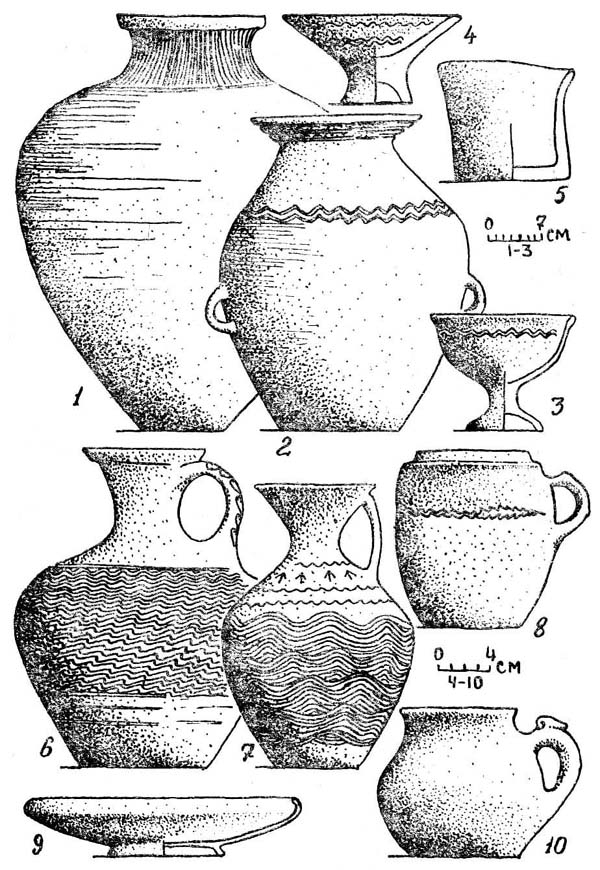 Рис. 13. Цебельдинские керамические изделия II—IV вв.: 1, 2, 10 — Шапка; 4-5, 8, 9 — Цибилиум; 7 — Апушта.