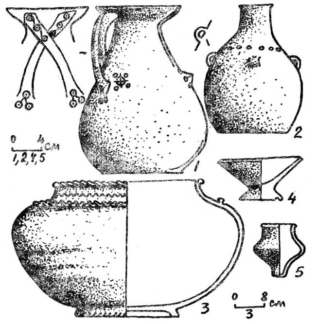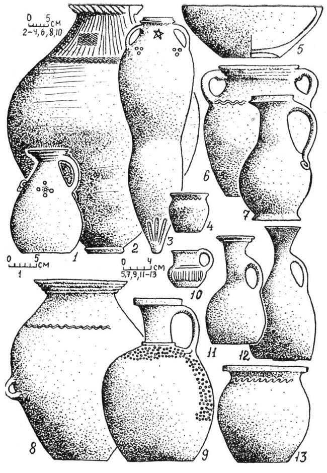 Керамика IV в. мало меняет свой облик: несколько округляются тулова у одноручных кувшинчиков, венчики их постепенно принимают чашечкообразную форму с бороздчатым оформлением, поддон у вазочек несколько понижается. В погребениях появляются плоскодонные пифосы с массивным венчиком, миски, котлы, ритуальные сосуды в виде фигурок оленя, быка и т. д. В украшении [67] сосудов помимо сюжетов, бытовавших ранее, возникают нарезной и штампованный (главным образом крестовидный) орнаменты. Ручки многих сосудов оформлены по-прежнему — жгутом по краю. Амфоры привозные.