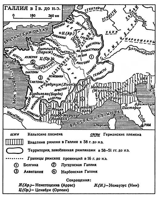 В Западной Галлии ситуация совершенно другая — конфликты, по крайней мере в первое время, касались лишь самих галлов: пришельцы воевали против местного населения. Цезарь говорит нам, что до его прихода войны в Галлии были постоянными. Они были двух типов. Прежде всего территориальными: вторжения белгов нарушили неустойчивое равновесие «первого» кельтского населения Галлии. Подобно эффекту домино многие народы переместились к югу и западу. Сами белги не останавливаются на берегах Сены, а переправляются через Ла-Манш, и часть из них остается на юге Британии. Теперь, по остроумному выражению Камиля Жюлиана, «Ла-Манш становится белгским Средиземноморьем». Другие войны были межплеменными: это могли быть набеги длительные или продолжительные с целью грабежа, установления гегемонии, захвата заложников. Такие набеги, непременно сопровождавшиеся реваншами, явно имели агонистический характер; они поддерживали боевой дух белгов — единственного племени галлов, не растерявшего свою воинственность за три века независимости. Цезарь говорит нам, что до его прибытия белги каждый год переправлялись через Рейн воевать с германцами. Цезарь особо ценил этот способ поддержания если не дружбы, то по крайней мере здорового боевого противостояния.