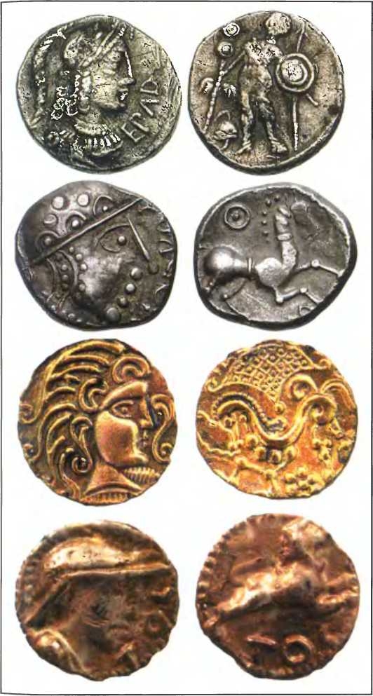 Монеты галльских племён (сверху вниз): арвернов, эдуев, паризиев, секванов