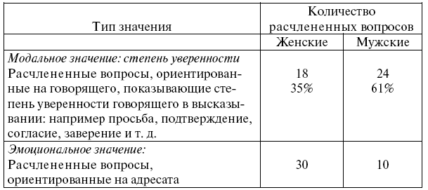 Женщины и мужчины не столь сильно отличаются по общему числу использования расчлененных вопросов (но заметим, что женщины в действительности используют больше расчлененных вопросов). Однако важный момент, который необходимо отметить, состоит в том, что 59 % расчлененных вопросов, используемых женщинами, являются поддерживающими (facilitative) (по сравнению с 25 % для мужчин), в то время как 61 % расчлененных вопросов, используемых мужчинами, являются модальными и выражают неуверенность (по сравнению с 35 % для женщин).