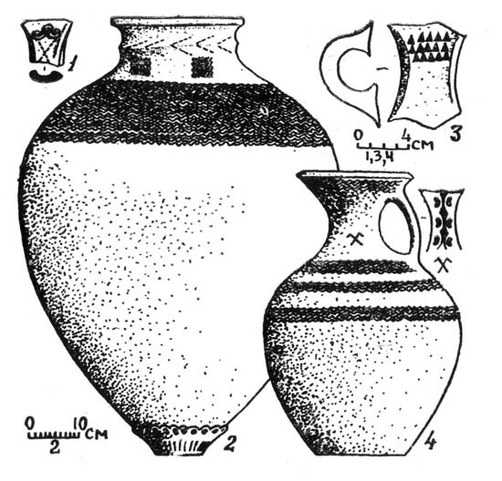Достаточно яркие «вторжения» со стороны отмечены и в керамике древней Цебельды. Это прежде всего амфоры, как по общей идее, так и в конкретных деталях созданные на основе общепричерноморских амфор с перехватом. Ранние цебельдинские амфоры (первая [85] половина V в.) и ряд кувшинчиков местного производства имеют характерный вертикальный венчик, связанный с аналогичным оформлением изделий позднеримского времени. Как в погребениях, так и на поселениях в V—VI вв. широкое распространение получили простые краснолаковые тарелки, часть которых могли изготовлять местные мастера.