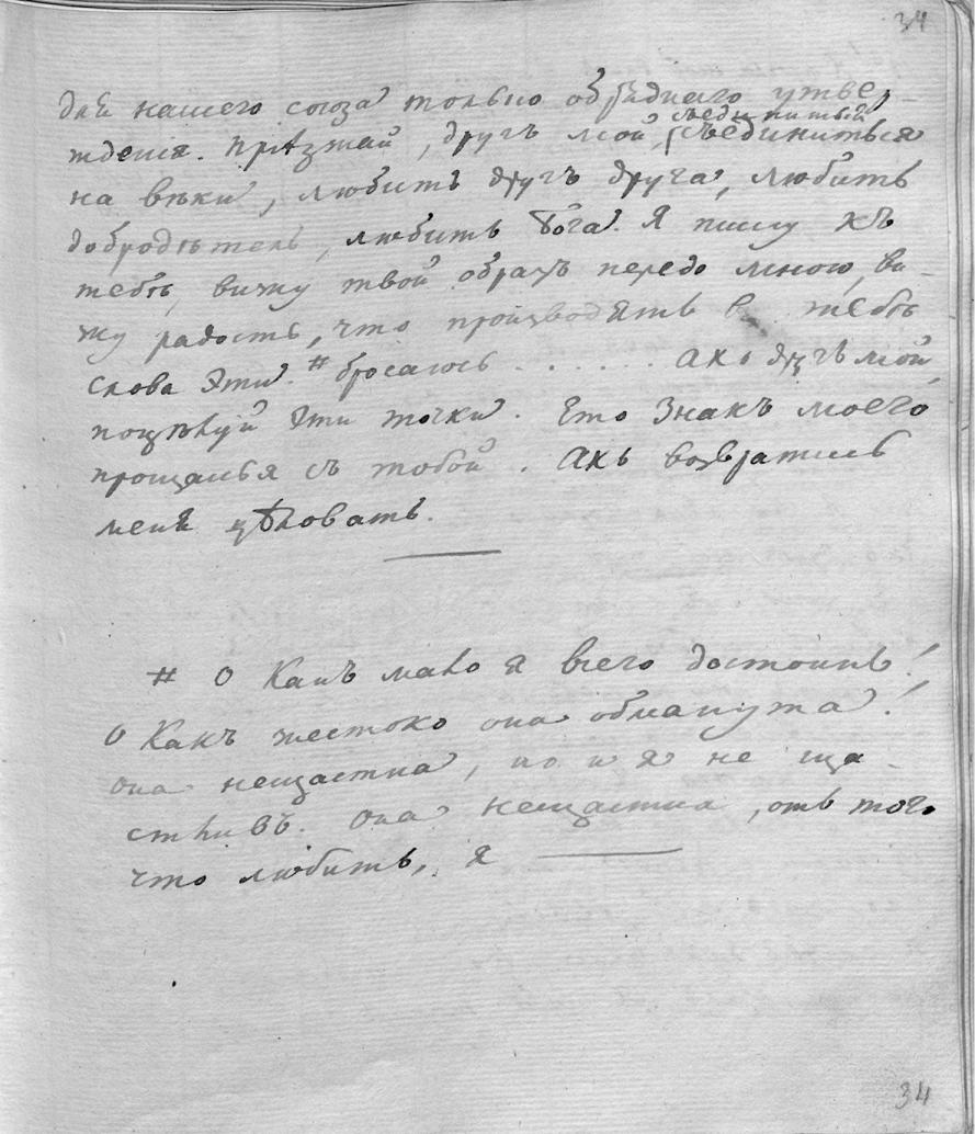 Покамест, ничей голос в слухе моем не будет раздаваться, кроме твоего, глаза мои будут видеть один твой образ, сердце мое будет желать тебя одного. <…> Приезжай мой друг, съединиться, съединиться со мной навеки, любить добродетель, любить Бога. <…> Ах возвратись меня целовать (ВЗ: 115).