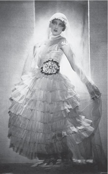 Сразу становится понятно, что перед нами – анахронизм, рарирет, диковинка. Кутюрье даже была готова согласиться с некоторыми изменениями, например укоротить длину юбки до колена, правда прикрыв ноги спадающим до пола тюлем или кружевным шлейфом. Такие модели носила актриса мадам Симона во время алжирского турне 1926–1927 годов.