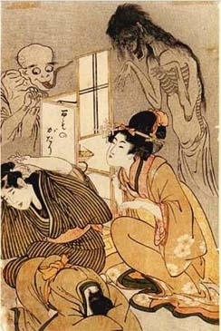 Деспотический феодальный режим, преобладавший в течение периода Эдо, в сочетании с природными катаклизмами, происходившими в то время, послужил появлению новых легенд о злых и мстительных духах и привидениях. В конце эры Эдо принимались указы, запрещающие показ театральных представлений с пугающими привидениями из-за страха подрыва авторитета правительства.