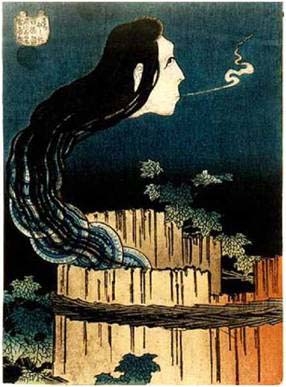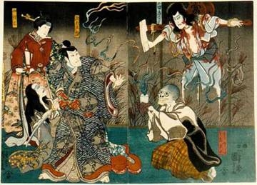 Мстительные духи стали центральной темой в театре Кабуки в конце 18-го века. Убийство ставили на сцене со всеми вопиющими деталями и женские духи изображались чётко. Сцены насилия и кровопролития были шокирующими и были направлены на то, чтобы вызвать подозрение и страх. К удивлению, эти пьесы были достаточно популярными и художники принтов репродуцировали множество сцен из подобных спектаклей Кабуки. Пример такой темы – в одной из пьес, поставленных в театре Кабуки, называемой «Скала, которая плачет ночью».