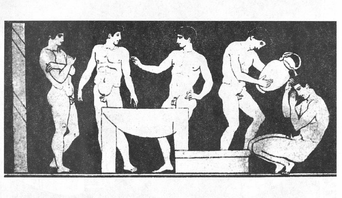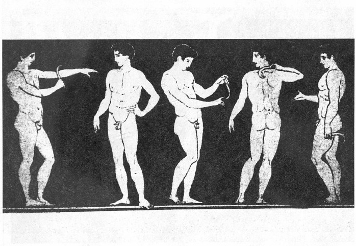 13. Атлеты в палестре перед тренировкой. Рисунок на краснофигурной вазе.