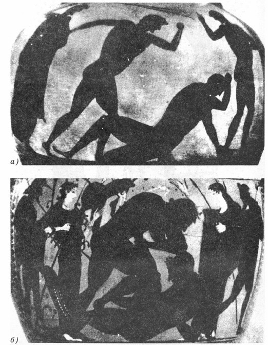15. а) Финал кулачного поединка: побежденный атлет отказывается от продолжения боя. б) Панкратиасты. Панафинейская амфора.