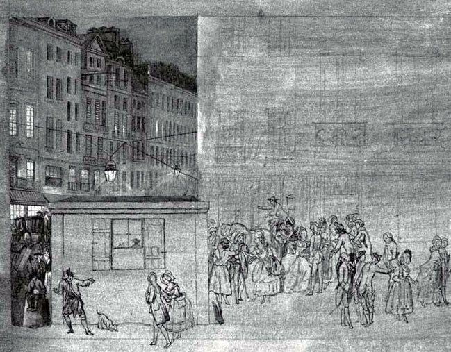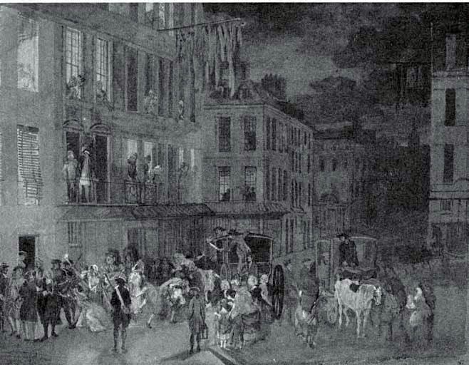 На улице так темно, что перед вторым экипажем, едва видным на заднем плане, идет человек с факелом, ведущий под уздцы лошадей. Если бы не свет, льющийся из окон здания, на улице вообще ничего не было бы видно. Однако на картине с лампами [рис. 37] ситуация меняется. Здесь тоже происходит множество событий: мужчины и женщины прогуливаются по улице Сент-Оноре, по проезжей части двигается не менее четырех экипажей. Улица освещена достаточно ярко, так что услуги людей с факелами не требуются. Здания, изображенные на обеих картинах, практически одинаковы, но с самим городом уже произошли чудесные изменения. Никто этого как будто не замечает, но парижская ночь впервые откинула покрывало, показав горожанам свое лицо.