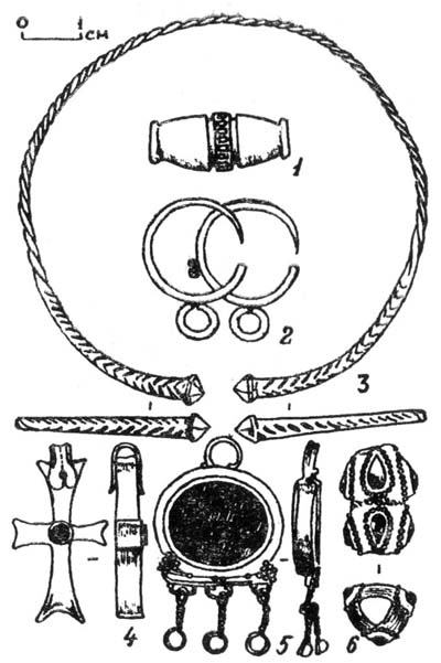 Группа украшений по их расположению у висков при отсутствии серег должна быть отнесена к височным подвескам. Часть их восходит [126] к местным прототипам бронзовой эпохи и характеризуется овальными, обычно бронзовыми колечками в полтора оборота, концы которых либо утолщены, либо имеют фаллическое оформление. Использовались они, как правило, в III—V вв.
