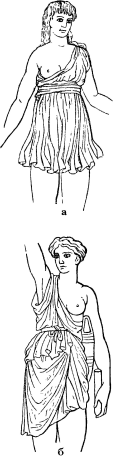 Одежда дорийских женщин мало отличалась от мужской. Она тоже состояла из верхней и нижней, но, тогда как юноши носили преимущественно только верхнюю одежду — гиматий, девушки предпочитали хитон. В простейшей форме женский хитон был очень похож на мужской и только в особенных случаях, например при гимнастических упражнениях и борьбе, отличался тем, что его для свободы движений спускали с одного плеча и подпоясывали повыше (рис. 16, а, б).