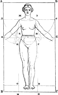 Для последнего рода хитонов брали четырехугольный кусок ткани, как и для простого хитона, но более длинный и широкий (рис. 18), складывали его по длине вдвое и сшивали сверху донизу, так что обе его продольные стороны (АВ и БГ) были сплошные и надевать его нужно было через голову. Одеваясь, сначала откидывали верхний край (Ад Бе) в виде отворота наружу (адбе), потом собирали его складками и сцепляли переднюю и заднюю его половину пряжкой на каждом плече.