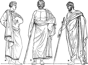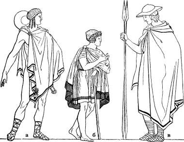 Ее носили преимущественно юноши, которые, судя по памятникам времен процветания греческого искусства, на торжественных играх ничего больше и не надевали. В форме простой продолговатой накидки она не доходила и до колен (рис. 22, а), а при большем объеме, когда использовалась в виде дорожного плаща, она опускалась до ступни (рис. 22, в).