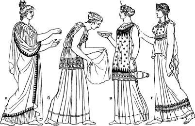 Ионийские женщины, пользовавшиеся гораздо меньшей свободой, чем дорийские, поддерживали старинную восточную традицию прятать все тело. Любопытно, что и мужчины носили закрывающую тело одежду.
