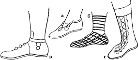 Башмаки были двух видов: низкие, закрывавшие только ступню (рис. 31, а), и высокие, заходившие за лодыжку (рис. 31, в). К этому же разряду обуви принадлежали и часто упоминаемые крепидис и эндромидис. Первые были нередко подбиты гвоздями. Высокие сапоги (рис. 31, г), похожие на ассирийские, были преимущественно обувью охотников и путешественников и надевались поверх чулок. Впрочем, простолюдины, пастухи и т. и. тоже нередко носили высокую обувь (рис. 35, в).