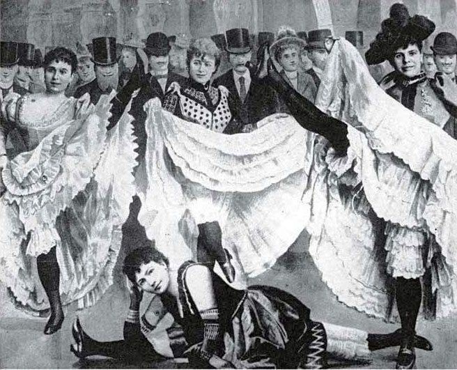 В принципе, история канкана могла бы остановиться именно в то время, в начале 1870-х годов. Танец, родившийся в парижских тавернах и танцевальных залах на пятьдесят лет раньше, постепенно трансформировался в специфический набор акробатических трюков, которые исполняли на подмостках варьете и мюзик-холлов Лондона и Парижа. Новое поколение исполнителей с хорошей растяжкой (как мужского, так и женского пола) прекрасно справлялось со своей задачей. Но в поле зрения зрителей не появилось ни одной кружевной юбки. Возможно, канкан так и сгинул бы, полностью переродившись в вариант спортивной гимнастики, если бы не Кейт Воэн [рис. 30], которая вдохнула в него новую жизнь, впервые исполнив «танец юбок» и стала первой, кто блеснул на публике белоснежными кружевными подъюбниками.