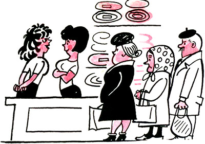 В учреждениях, где работники сидят за перегородками, нередко возникают недоразумения между посетителями. Если, войдя в помещение, вы видите перед окошечком очередь, станьте спокойно в конце. Всякая попытка обойти пришедших прежде вас вызовет возмущение и протесты тех, которые дисциплинированно стоят в очереди. Они несомненно призовут вас к порядку, не примут во внимание ваших отговорок вроде «Я только за одной маркой» или «Мне нужна только небольшая справка». Но стариков, больных и беременных женщин, которые не могут долго стоять в очереди, пускают, разумеется, вперед без разговоров.