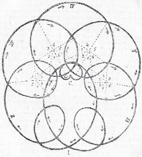 Таким образом, исторические циклы вовсе не концентричны, прогресс заключается вовсе не в увеличении радиуса циклов, а приводит к их продвижению внутри «круга стилей» от I к VI. И если мы захотим хоть приблизительно начертить «кривую истории», мы получим линию, образующую ряд эпициклоидов (ряд петель) вдоль периферии большого круга. Исходит эта линия из центра «круга стилей», начинается Архимедовой спиралью, проходящей, постепенно отдаляясь от центра, через все шесть секторов круга, соответствующих I–VI его отрезкам, и направляется к I дуге, к ирреализму.