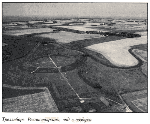 Изучение остатков мощных земляных валов в различных районах Ютландии и на датских островах с применением современных методов исследования, в частности аэрофотосъемки, дало в распоряжение ученых ценнейший новый материал. Основные открытия были произведены после второй мировой войны, К настоящему времени изучены лагеря Треллеборг[54] в западной части острова Зеландия, Аггерсборг[55] в Северной Ютландии, Фюркат[56] в Восточной Ютландии и Ноннебьерг (Ноннебаккен) в Оденсе, на острове Фюн; последние два лагеря исследованы частично. При известных и подчас немаловажных различиях, все лагеря объединяет наличие ряда общих черт, свидетельствующих о принадлежности всех их к одному типу. Лагеря представляют собой группы построек, обнесенных Концентрическими земляными валами и расположенных близ морского берега в месте, удобном для стоянки кораблей. Треллеборг стоял на мысе в 3–4 км от пролива Большой Бельт, связывающего юго-восточное побережье Дании с Каттегатом, Аггерсборг находился на Лимфьорде невдалеке от Северного моря, поблизости от него Фюркат — на берегу Каттегата; Ноннебьерг — на территории города Оденсе, в удобной и большой гавани, иными словами, эти лагеря занимали выгодное стратегическое положение, позволявшее господствовать над важнейшими морскими путями.