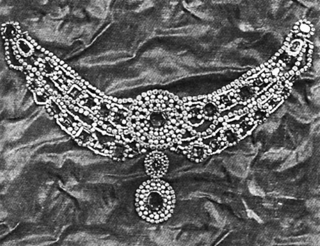Отправилось на зарубежные аукционы сделанное в последние годы XIX века из коронных камней для знаменитого придворного маскарада 1903 года ожерелье с подвеской-«севинье», выдержанное в стиле времён царя Алексея Михайловича и сплошь усыпанное алмазами, перемежающимися с нитями жемчуга, красиво сочетающимися с вкраплениями густо-зелёных изумрудов. Хотя оно и собрано наспех с помощью тонких серебряных нитей, но великолепно по компоновке и общему рисунку.[739]