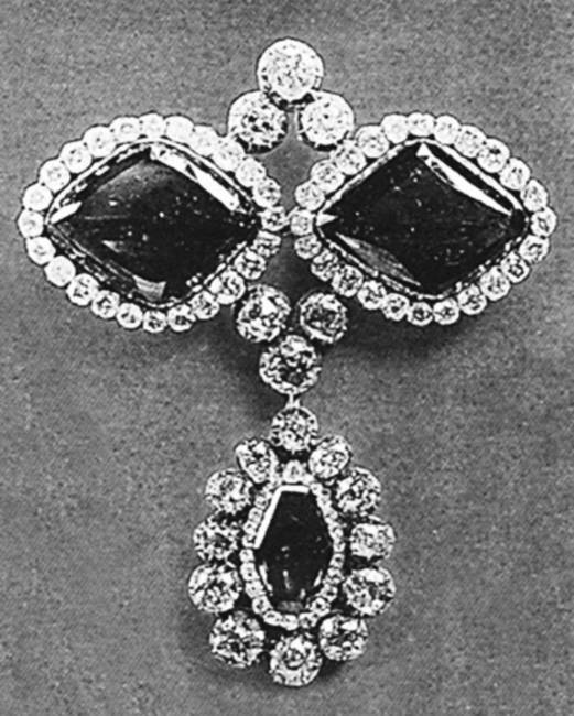 Некогда эти два смарагда, окружённые 48 бриллиантами в 38 карат, украшали замочки пары браслетов императрицы Марии Феодоровны, супруги Павла I. Однако следует сказать, что один из сих «больших продолговатых изумрудов, хорошаго цвету, но с пороками» был заимствован с верхушки «цепочки крючком» усыпанных бриллиантами и смарагдами карманных часов императрицы Елизаветы Петровны. В середине XIX века эта изумительная работа английского часовщика Годфри Поя вместе с многими коронными вещами оказалась в Галерее драгоценностей Императорского Эрмитажа.[741] Поэтому когда начались работы над брошью, с одного из изумрудов сделали точную копию из стекла, имитировавшего драгоценный камень, и вставили её на законное, почти столетие остававшееся пустым место. Кстати, эта замена спасла дивные часы от продажи на аукционе, так как чересчур «разборчивые» покупатели не пожелали приобретать вещь с фальшивыми камнями.[742]
