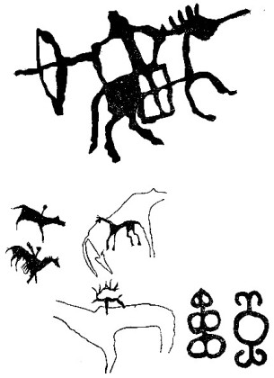 Рис. 58. Аналогии древнетюркским всадникам Монголии — курыканские рисунки с р. Куды (Иркутская область)