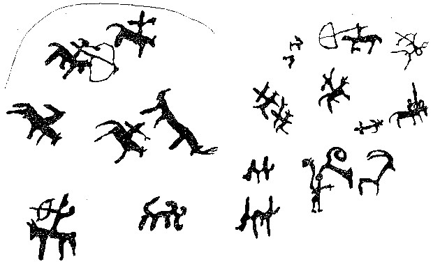Среди рисунков, выбитых силуэтом, выделяются две группы. В первую входят козлы, бараны и верблюд, во вторую — конь с крючкообразно загнутым хвостом и олень (в верхней части скалы).