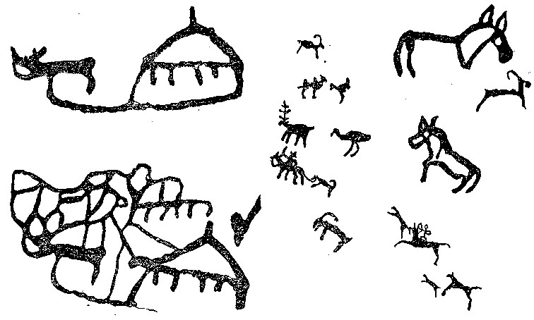 Рис. 63. Рисунки из окрестностей г. Кобдо (справа) и Среднегобийского аймака