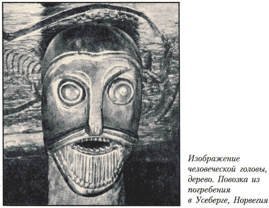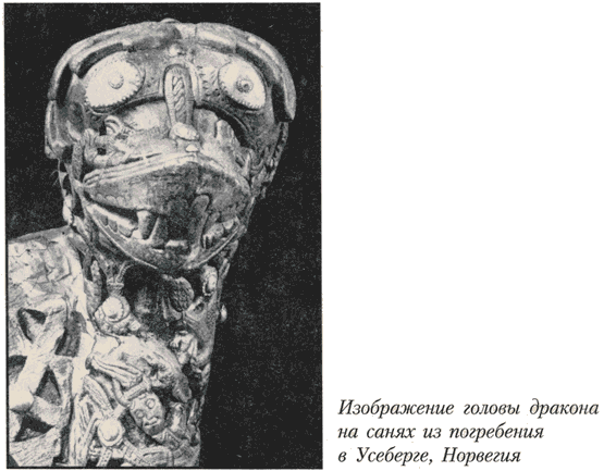 В норвежских кораблях, спрятанных в курганах, имелись погребальные камеры, в которых лежали останки их хозяев. В двух кораблях были похоронены мужчины, в усебергском корабле — женщина. По мнению норвежских историков, то была «королева» Аса — бабка объединителя Норвегии Харальда Прекрасноволосого. Она умерла молодой. Судя по останкам, ей было немногим более 30 лет. Рядом нашли труп старой женщины, очевидно, ее рабыни, последовавшей за нею в могилу, чтобы продолжать служить ей в загробном мире[23]. Вместе со своей хозяйкой в царство богов на усебергском корабле отправилось более дюжины коней и собаки. Кровати и кухонная утварь, сундуки и кадки, украшения и продовольствие, постели и ручной ткацкий станок — короче, все, чем пользовалась эта знатная женщина в своей земной жизни, было уложено при погребении в ее корабль. Особенно интересны сани и повозка. Они украшены богатым резным орнаментом, выполненным несколькими искусными мастерами в разных стилях.