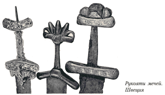 Хотя монеты попадали на скандинавский Север не только вследствие грабежа, но и в обмен на вывозимые в империю товары, в самих скандинавских странах в римский период эти деньги хождения не имели — торговля здесь еще оставалась меновой. Тем не менее скандинавы охотно выменивали свои товары на серебро с юга и зарывали его в землю. Представления о золоте как основе и мериле всяческого богатства проникали в Скандинавию в конце римского периода и во времена «Великих переселений народов». Они нашли отражение и в народном эпосе. Показательно, что эртог (эре) — название единицы веса и монеты в средневековой Скандинавии — происходит от позднеримского серебряного денария (denarius argenteus). О давних торговых связях Северной Европы с другими странами говорят и многочисленные находки на полуострове бронзовых, золотых, серебряных, стеклянных и глиняных сосудов, украшений, оружия и других предметов из римских провинции. Скандинавы поддерживали торговые связи и с королевствами, образовавшимися на территории Римской империи после ее падения. Особенно велик был на Севере спрос на оружие из стран, где ремесло было более развито. Запреты франкских государей продавать оружие славянам и норманнам, сделавшимся в IX в. опасными соседями Франкской империи, свидетельствуют о наличии в предшествующий период импорта оружия в Скандинавию. В песнях скальдов многократно упоминаются франкские мечи; немало их найдено и археологами[27].