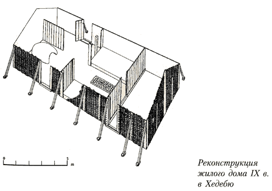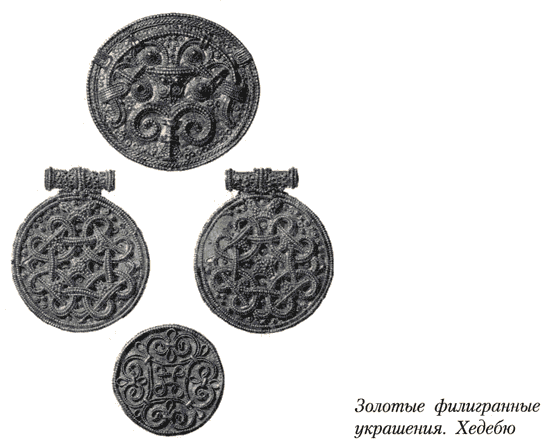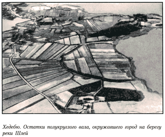 Хедебю (Хайтабу) — буквально: «город язычников»[29] — был наиболее крупным из этих первых городов-эмпорий и самым важным в торговом отношении. Как установили археологи, в период своего расцвета — в X в. — Хедебю занимал площадь около 24 га (в IX в. она была вдвое меньшей). Расположенный на берегу озера в верховьях реки Шлей, впадающей в Балтийское море, город обладал удобной для судов гаванью. Он был обнесен полукруглым валом, который защищал его со стороны суши. Вал из земли и дерева, длиной около 1300 м, хорошо сохранился. На холме севернее города находилось еще одно укрепление, по-видимому, более раннего времени, чем вал. Внутри городской черты найдены остатки небольших домов, обнесенных оградой и образовавших узкие улочки. Отмечается единообразие и стабильность застройки. Раскопки на территории города и многочисленных погребений (общее их число ориентировочно составляет 3–5 тыс.) свидетельствуют о наличии в Хедебю ремесленников, занимавшихся гончарным делом, обработкой железа из болотной руды, ввозившейся из Швеции, ткачеством, работой по кости и рогу, производством стекла (стеклянных бус), чеканкой монеты, изготовлением украшений из бронзы и драгоценных металлов. Ювелиры владели техникой изготовления зерни и скани. Раскопками установлено местонахождение отдельного ремесленного квартала.