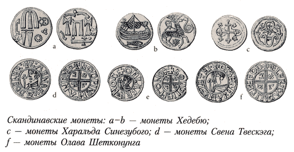 К ранним кладам (вторая половина IX и Х в.), найденным на Готланде, относятся почти исключительно куфические арабские монеты. С конца X — начала XI в. начинают преобладать монеты немецкой чеканки, тогда как число монет из Халифата резко сокращается. На XI в. приходится большинство кладов, содержащих английские монеты. Эти наблюдения говорят о расцвете готландской торговли с Востоком в первый период норманнской активности и о сокращении этой торговли с конца X в. (причины этого сокращения не ясны, предполагают, что приток арабского серебра прекратился ввиду истощения запасов его в Халифате), а также происшедшем одновременно оживлении торговых связей с Западом. Приток монет из Германии, наблюдающийся начиная со второй половины X в., был связан с разработкой серебряных рудников в Гарце. Обилие английских монет в период между 990 и 1020 гг. объясняется тем, что как раз в это время датские завоеватели взыскивали с английских королей огромные суммы в виде контрибуций («датские деньги»), а после перехода Англии под власть Кнуда Датского, его воины получали жалованье за службу. На Готланд эти монеты попали преимущественно в результате торговли[44].