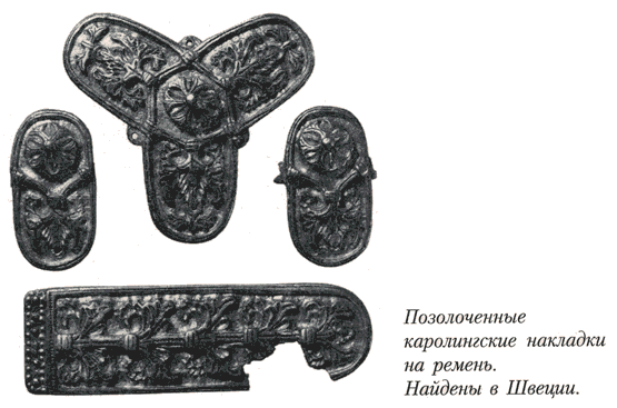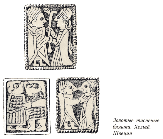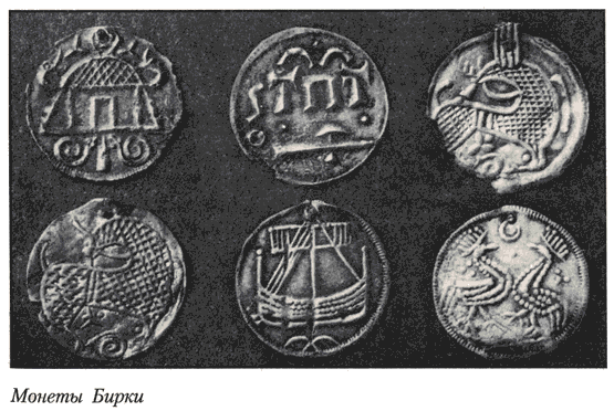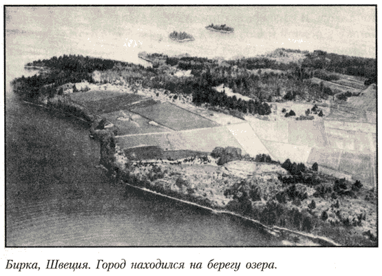 Бирка возникла почти одновременно с Хедебю — около 800 г. До ее основания на соседнем острове — Хельгё, расположенном примерно в 11 км от Бирки, существовал другой торговый центр — Лиллё, обнаруженный впервые в 50-х годах XX в.[38] Эта фактория датируется VII–VIII вв., хотя поселение на острове восходит к еще более раннему времени. На месте, где находился Лиллё, наряду с арабскими монетами найдены осколки стеклянных изделий, привезенных из Франкского государства, епископский посох ирландского производства, золотые бляшки скандинавского происхождения с изображением целующихся или танцующих пар[39] и даже такой неожиданный гость на севере Европы, как маленькая бронзовая статуэтка Будды. Но на Хельгё существовало и ремесло. Здесь производили плавку железа, обрабатывали металл (найдены орудия труда, множество железных и бронзовых замков с ключами), изготовлялись стеклянные бусы. По-видимому, в конце VIII или начале IX в. основной центр торговли был перенесен из этого пункта в Бирку, в которой сконцентрировались связи с арабским Востоком, шедшие по волжскому пути. С другой стороны, Бирка оказалась связанной удобными речными путями со многими пунктами в Средней Швеции, а морем — с северными ее районами, а также с Хедебю, островом Готланд и южным побережьем Балтики. В IX в. в Бирке чеканилась собственная монета по франкскому образцу[40].