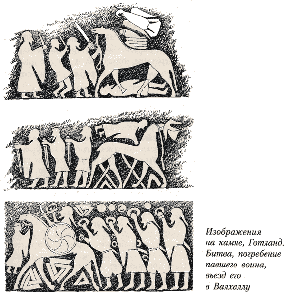 Неизвестно, сколько кораблей викингов, ушедших в океан, исчезло в его пучине. Лишь в отдельных случаях мы узнаем о судьбе этих мореплавателей. Так, на камне, воздвигнутом в XI в. в Западной Норвегии в память о погибших моряках, сохранилась руническая надпись, повествующая об экипаже корабля, затертого во льдах близ Гренландии; люди покинули судно и по движущемуся льду пошли к берегу острова, страдая от мороза и голода. «Жестокая судьба погибнуть так рано, — гласит надпись, — ибо удача их оставила»[25]. Руническая надпись из Дании говорит о человеке, который «утонул в море вместе со всеми своими спутниками».