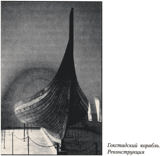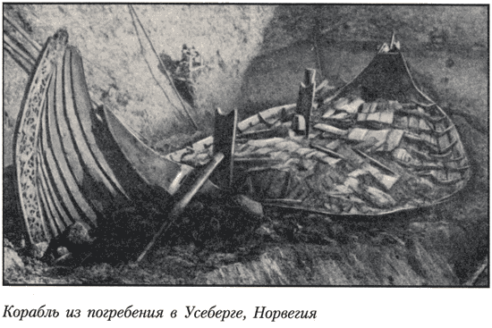 Но прежде чем говорить об этих кораблях, нужно ответить на вопрос: почему они оказались запрятанными в курганы? По языческим верованиям скандинавов, умерший человек в загробном мире продолжал вести тот же образ жизни, что и на земле: есть, трудиться, сражаться, развлекаться. Князья и дружинники считали, что они и после смерти останутся господами, а рабы и домочадцы будут прислуживать им. Поэтому знатных людей обычно хоронили со всякого рода утварью, богатством, оружием и иногда даже в кораблях[19]. Любопытно, что все три корабля, найденные в Норвегии, стояли в курганах повернутые носами к югу, к морю, как бы готовые отправиться в путешествие. Судя по находкам, погребенные в них покойники были снаряжены всем необходимым для загробного существования, достойного их высокого происхождения, однако большая часть вещей, в особенности ценных, исчезла: курганы еще в средние века были разграблены (в борту судна в Гокстаде воры пробили большую дыру, через которую вынесли все богатства). Но сами корабли остались и, несмотря на повреждения, вызванные давлением тяжести земли кургана, неплохо сохранились в глинистой почве, не пропускавшей к ним воздуха. Ныне они реставрированы и выставлены в специальном музее близ Осло.
