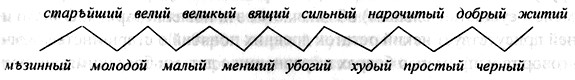 Последовательность переходов определяется четкой связанностью антонимов, но реально, в жизни, были какие-то более сложные отношения, потому что одни слова дольше бытовали в языке, другие – меньше. Великый, например, вступает в связь не только со своими ближайшими соседями по схеме, его связь идет дальше, к словам убогий и худый; слово сильный связано еще и со словом менший (правда, только в церковных текстах, из которых пришло и само сильный). И все же поступательный ход развития противоположностей эта схема показывает вполне удовлетворительно, а главное – весьма наглядно.