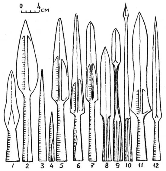 Рис. 29. Железные наконечники копий и дротиков IV—VII вв.: 1-10 — Шапка, 11, 12 — Лар.