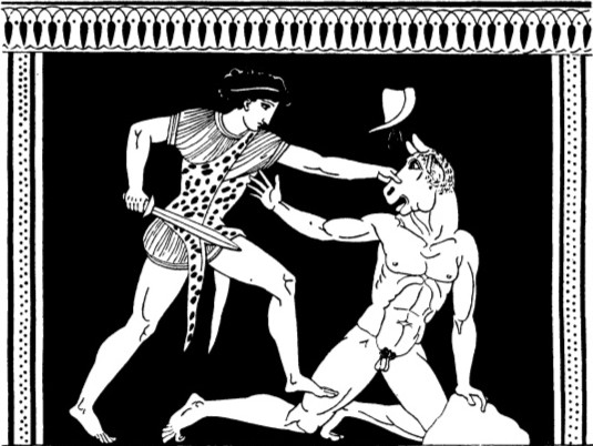 Тем временем на родине Посейдон вдохнул в царицу неукротимую страсть к быку. И она уговорила искусного царского мастера, несравненного Дедала, изготовить для нее деревянную корову, которая ввела бы быка в заблуждение — и в которую она с нетерпением вошла; и бык был обманут. Царица родила чудовище, которое со временем стало опасным. И снова был призван Дедал, на этот раз царем, для того чтобы возвести огромный лабиринт с тупиками, в котором можно было бы укрыть это существо. Настолько искусным было это сооружение, что, закончив его, Дедал сам едва нашел обратный путь к выходу. Туда и поместили Минотавра: и впоследствии посылали к нему на съедение юношей и девушек, доставляемых из критских владений в качестве дани с завоеванных народов[22].