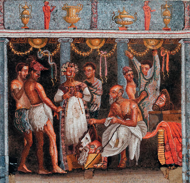 Актеры готовятся к сценической импровизации. Мозаика. Национальный музей археологии, Неаполь